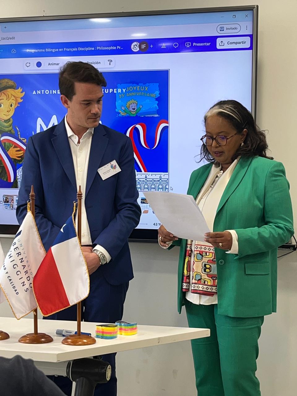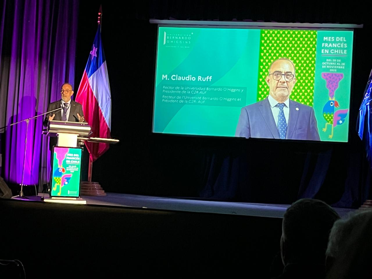 Por la tarde, la ceremonia oficial de inauguración reunió a embajadoras y embajadores de países francófonos, al Rector de la UBO, Dr. Claudio Ruff —quien pronunció el discurso inaugural—, a autoridades del Ministerio de Educación y a la Sra. Zahra Kamil Ali, Representante de la Organización Internacional de la Francofonía (OIF) para las Américas, quien saludó la cooperación entre el sistema educativo chileno y la red francófona. En su intervención, el rector Ruff destacó la importancia de la incorporación de Chile a la OIF como Estado observador en 2024, y reafirmó el compromiso institucional de fortalecer competencias lingüísticas, promover el diálogo intercultural y ampliar las oportunidades de cooperación para estudiantes y docentes en Chile.